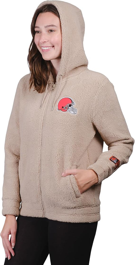 Ultra Game NFL Official Women's Super Soft Sherpa Full Zip Hoodie Sweatshirt Jacket, Cleveland Browns, Sand|Cleveland Browns