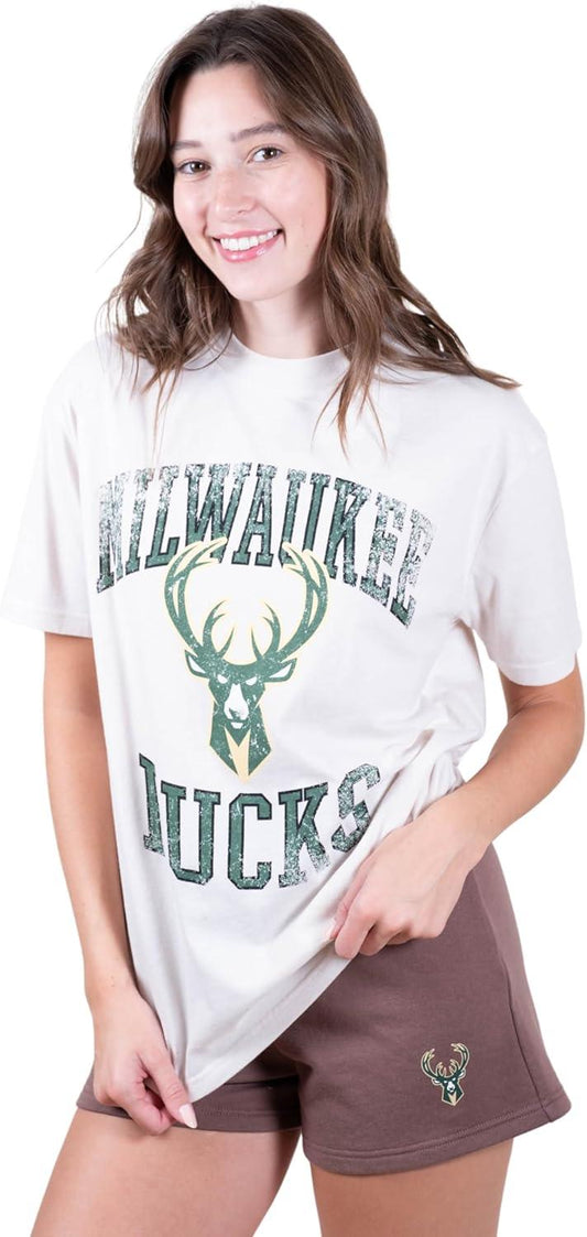 Ultra Game NBA Official Women's Super Soft T-Shirt & Short Set, Milwaukee Bucks, White|Milwaukee Bucks