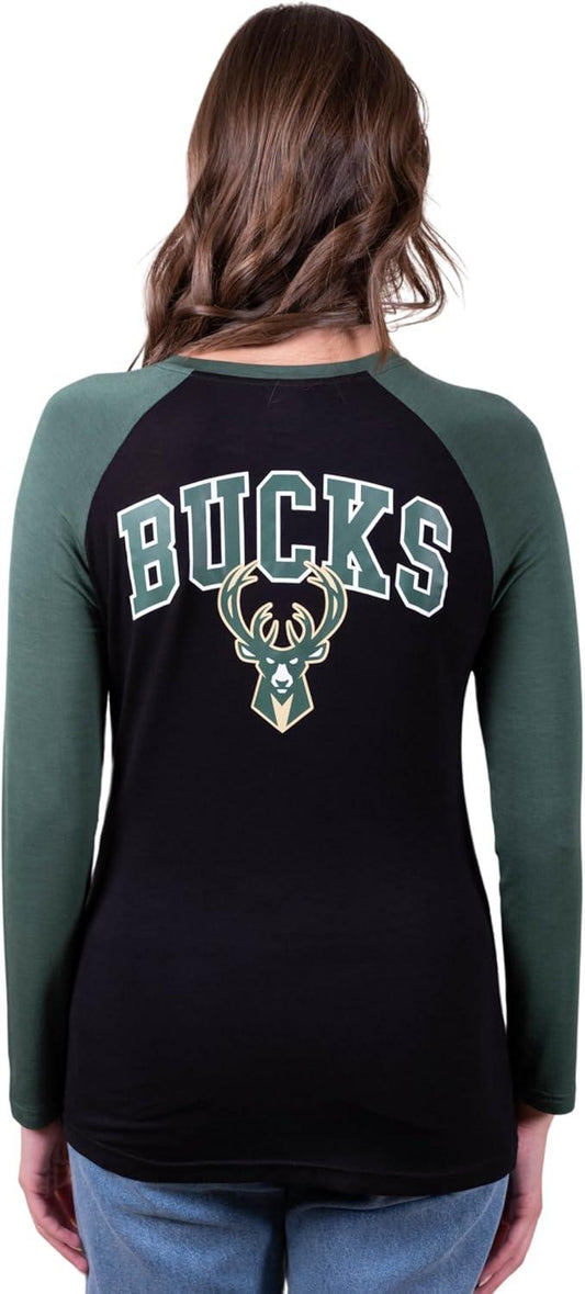 Ultra Game NBA Official Women's Super Soft Long Sleeve Lace-up Shirt, Milwaukee Bucks, Black|Milwaukee Bucks
