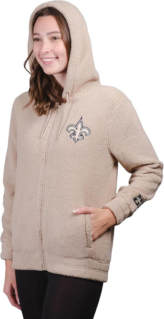 Ultra Game NFL Official Women's Super Soft Sherpa Full Zip Hoodie Sweatshirt Jacket, New Orleans Saints, Sand|New Orleans Saints