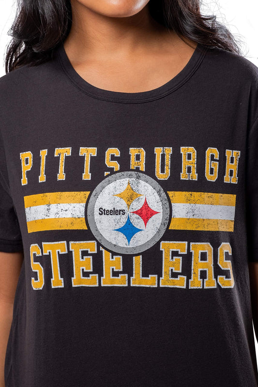 Ultra Game NFL Official Women's Distressed Graphics Super Soft Crew Neck T-Shirt, Pittsburgh Steelers, Team Color|Pittsburgh Steelers