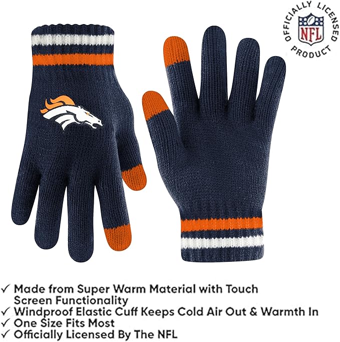 Ultra Game Youth NFL Official Super Soft Team Stripe Winter Beanie Knit Hat with Extra Warm Touch Screen Gloves|Denver Broncos