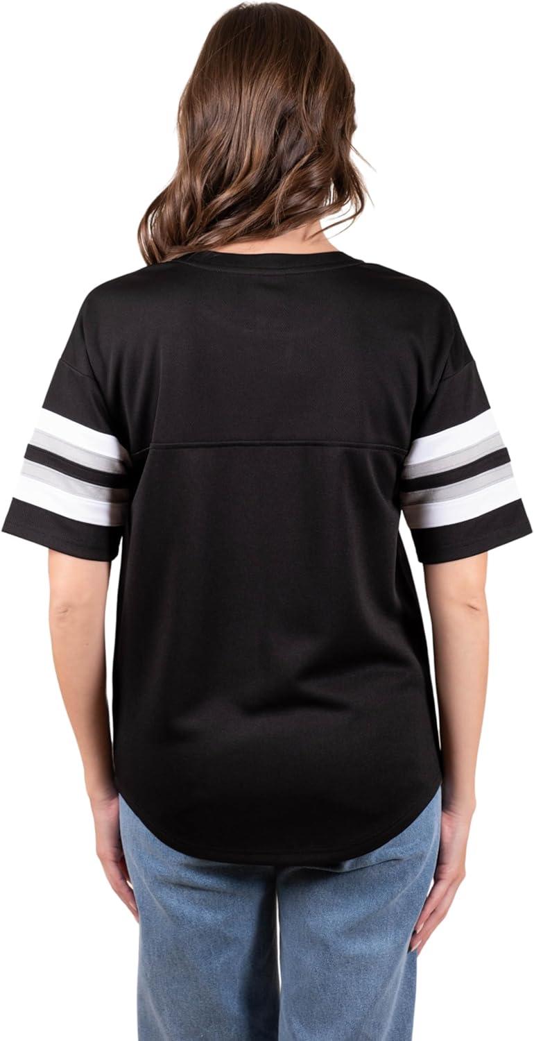 - JERSEY-STRIPED SLEEVES: The short sleeves feature bold jersey striping in official team colors.