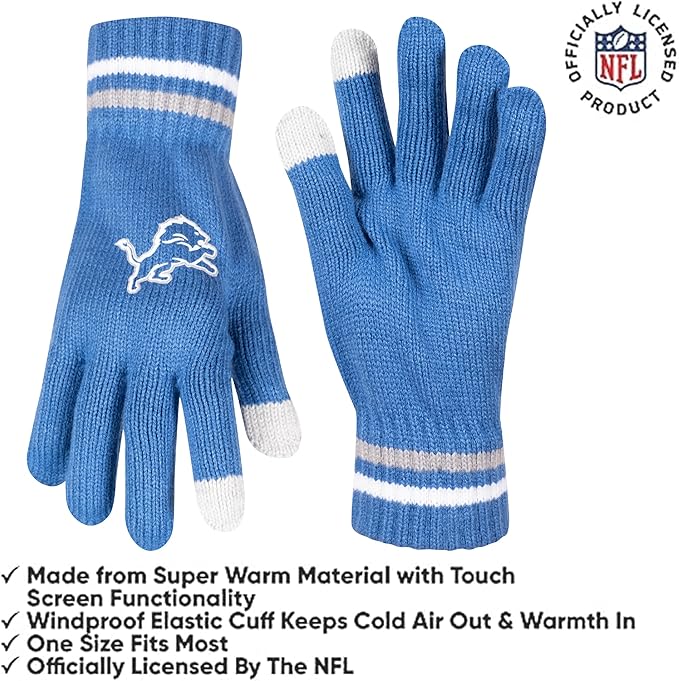 NFL Official Adults Unisex Super Soft Winter Beanie Knit Hat With Extra Warm Touch Screen Gloves|Detroit Lions