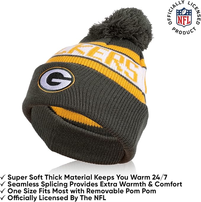 - STYLE AND DESIGN: Hat Includes fashionable pom-pom. Classic team Logo on the front. High quality graphics of your favorite NFL team in official team colors.