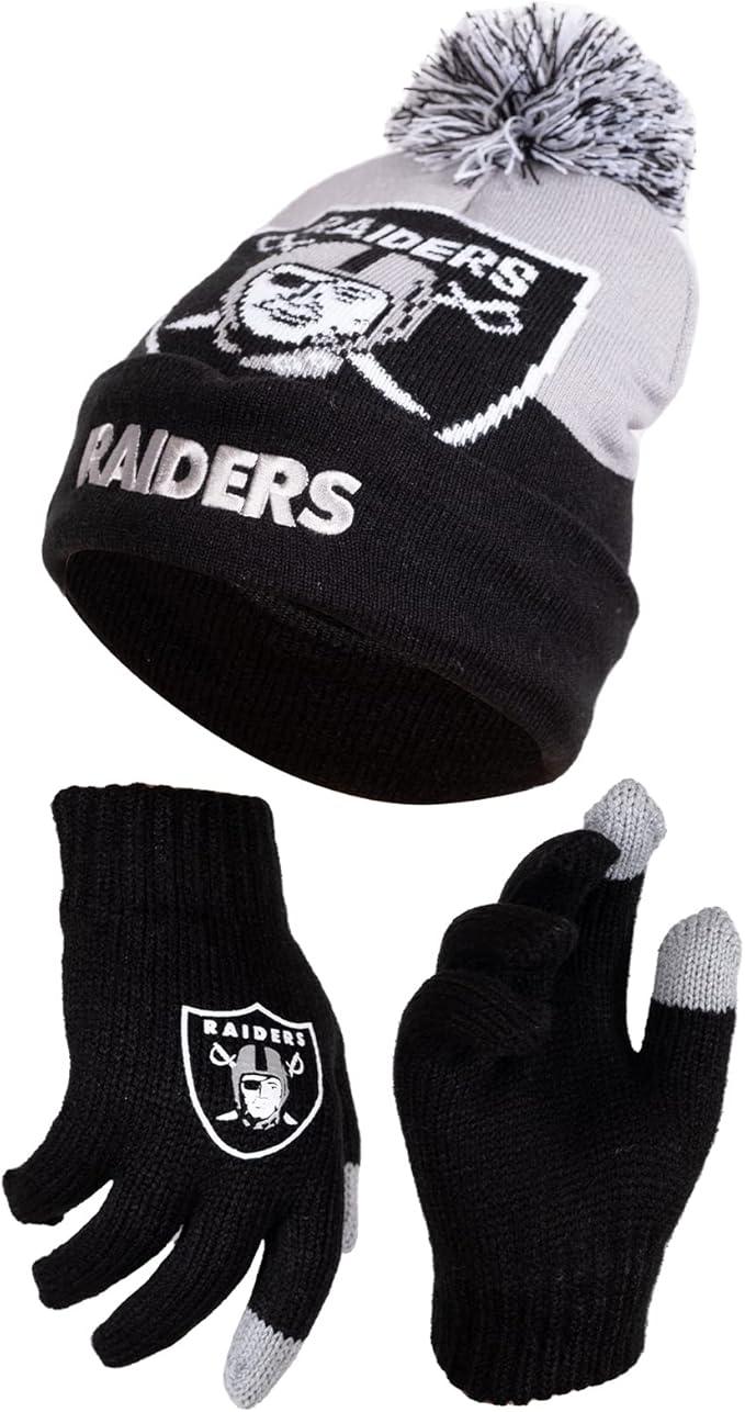 NFL Official Youth Super Soft Winter Beanie Knit Hat With Extra Warm Touch Screen Gloves| Las Vegas Raiders
