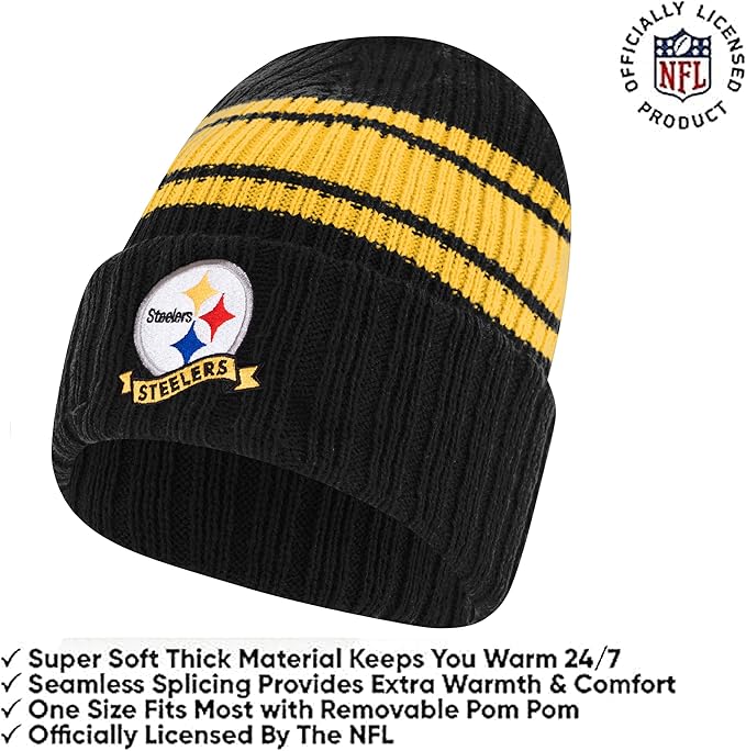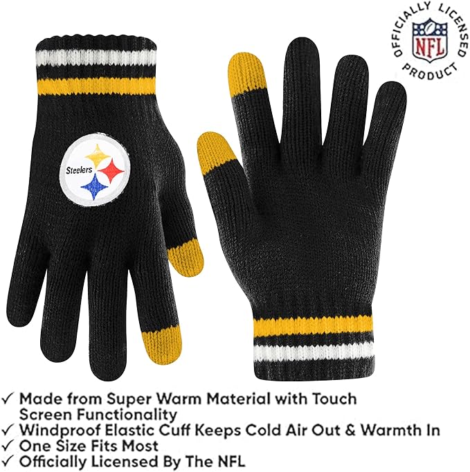 Ultra Game Youth NFL Official Super Soft Team Stripe Winter Beanie Knit Hat with Extra Warm Touch Screen Gloves|Pittsburgh Steelers